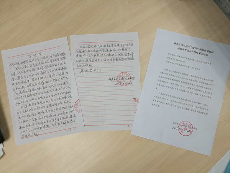 當(dāng)?shù)卣謩e給實(shí)施該項(xiàng)目的中國地質(zhì)調(diào)查局、中國地質(zhì)科學(xué)院探礦工藝研究所以及我院授予錦旗,并親筆手寫感謝信,感謝項(xiàng)目組在脫貧地區(qū)開展水文地質(zhì)調(diào)查和施工探采結(jié)合井工作,以及對地方老百姓的熱切關(guān)心和幫助。
