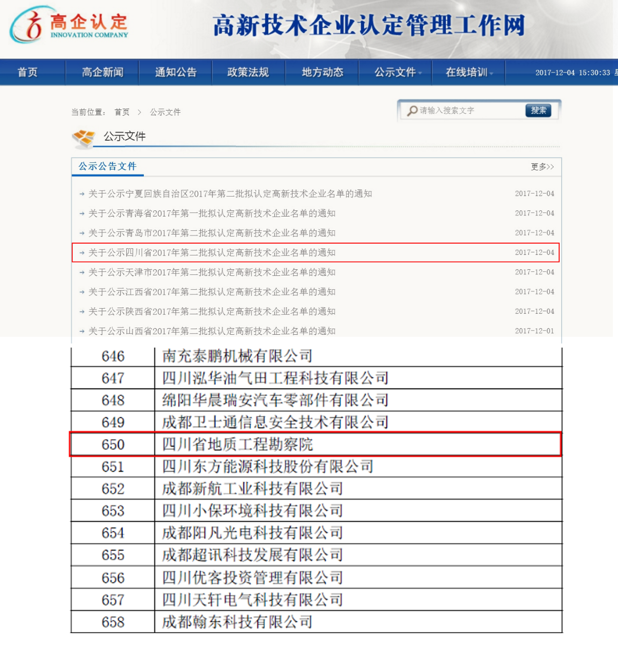 12月4日,國家高新技術企業認定官網發布了“四川省2017年第二批擬認定高新技術企業的公示名單”,四川地質工程勘察院名列其中,榮膺高新技術企業認定。