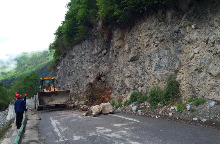 在管理人員的耐心指揮下,排危人員對坡面殘留的危石進行了仔細地清除,在確定沒有松動危石后,下部裝載機對路面堆積的土石體進行了清理,我院管理人員協助路橋的交通指揮員,對積壓的車輛進行了分批次放行,確保所有積壓車輛安全迅速地通過排危路段后,交通得到了恢復,將現場的道路交通維護工作移交給四川路橋,結束了排危工作。