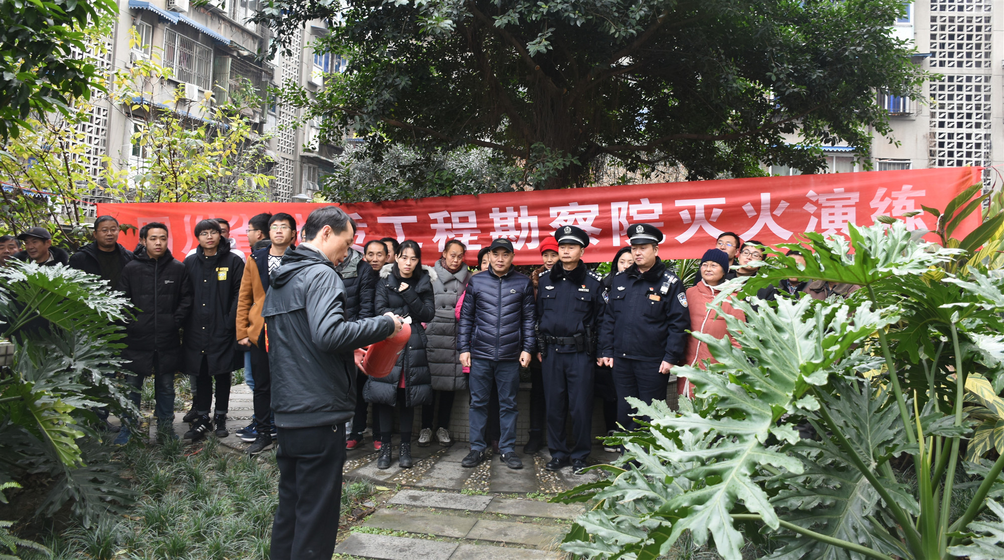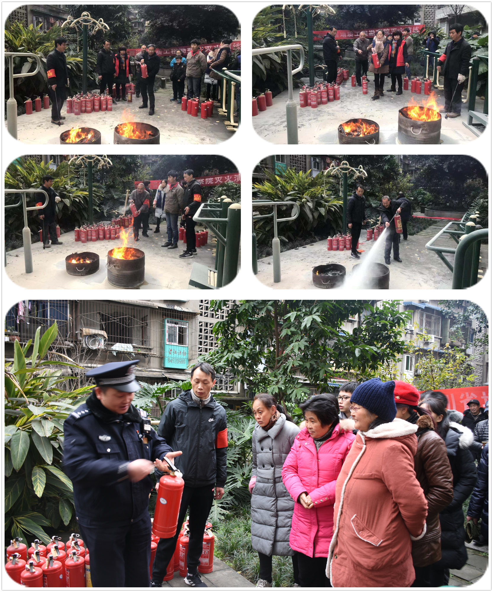 演練工作人員和社區民警首先給大家講解了滅火器的使用方法及注意事項,隨后在工作人員的指導下,參加演練的60余名干部職工及家屬先后使用滅火器對現場兩處著火點進行實戰滅火。