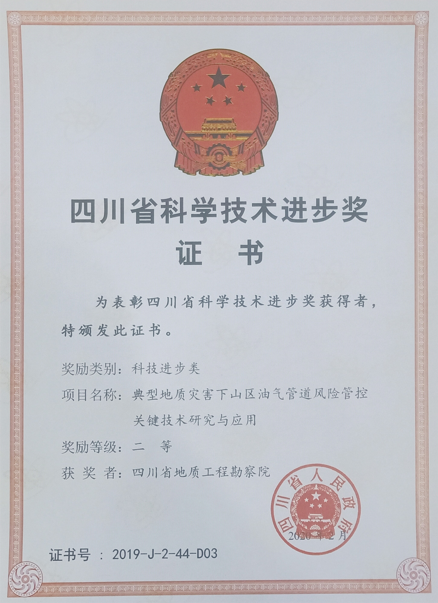 4月21日上午,四川省科學技術獎勵大會在成都舉行,大會公布了2019年度四川省科技進步獎獲獎名單。其中,四川省地質工程勘察院集團有限公司《典型地質災害下山區油氣管道風險管控關鍵技術研究與應用》項目獲四川省科學技術進步獎二等獎。